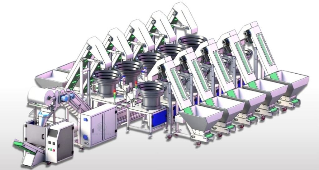 Its vibratory bowl uses vibration and spiral tracks to sort messy materials; the packaging module counts, fills, seals, and cuts into bags.